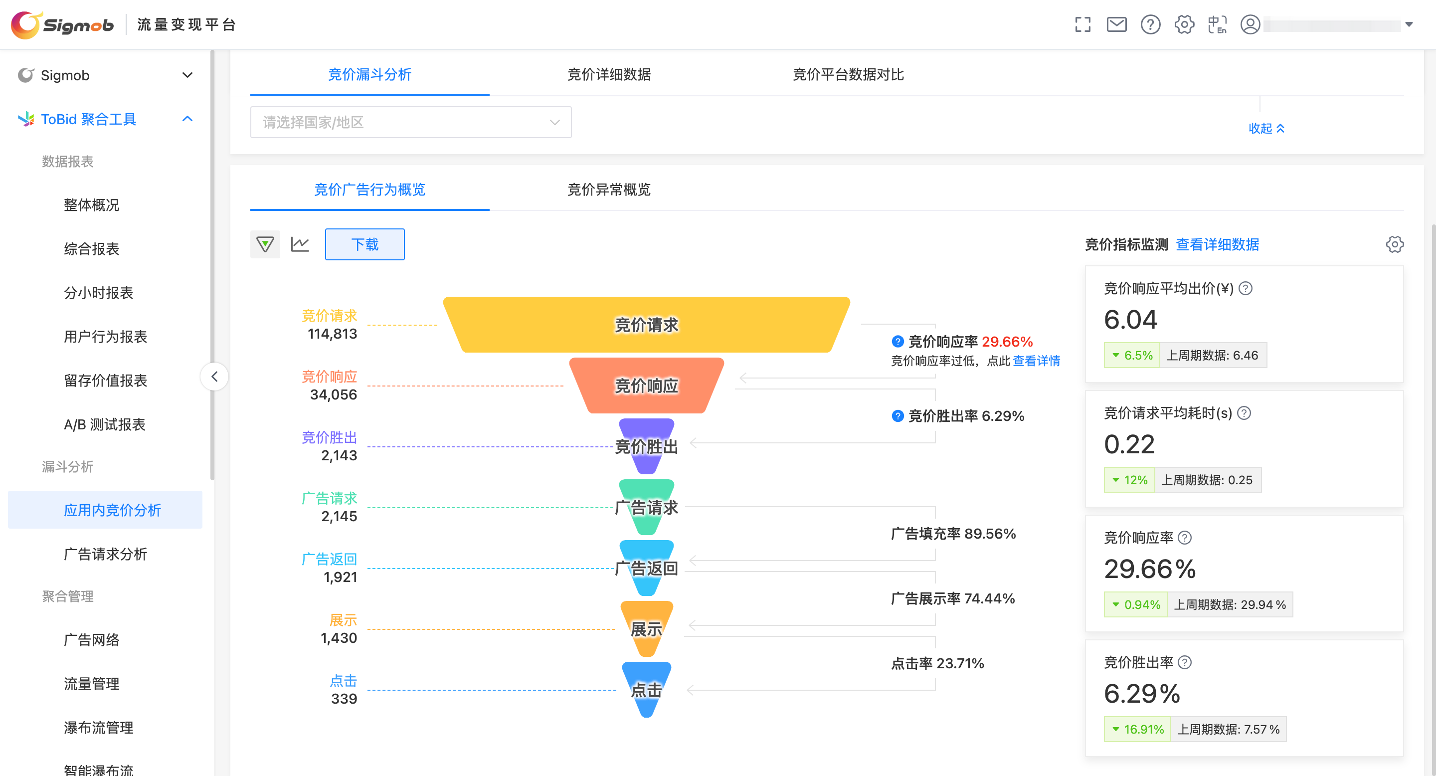 点击【漏斗分析】-【应用内竞价分析】竞价漏斗分析页面,可查看广告在头部竞价广告请求链路产生的数据。报表通用逻辑请见数据报表基础说明
