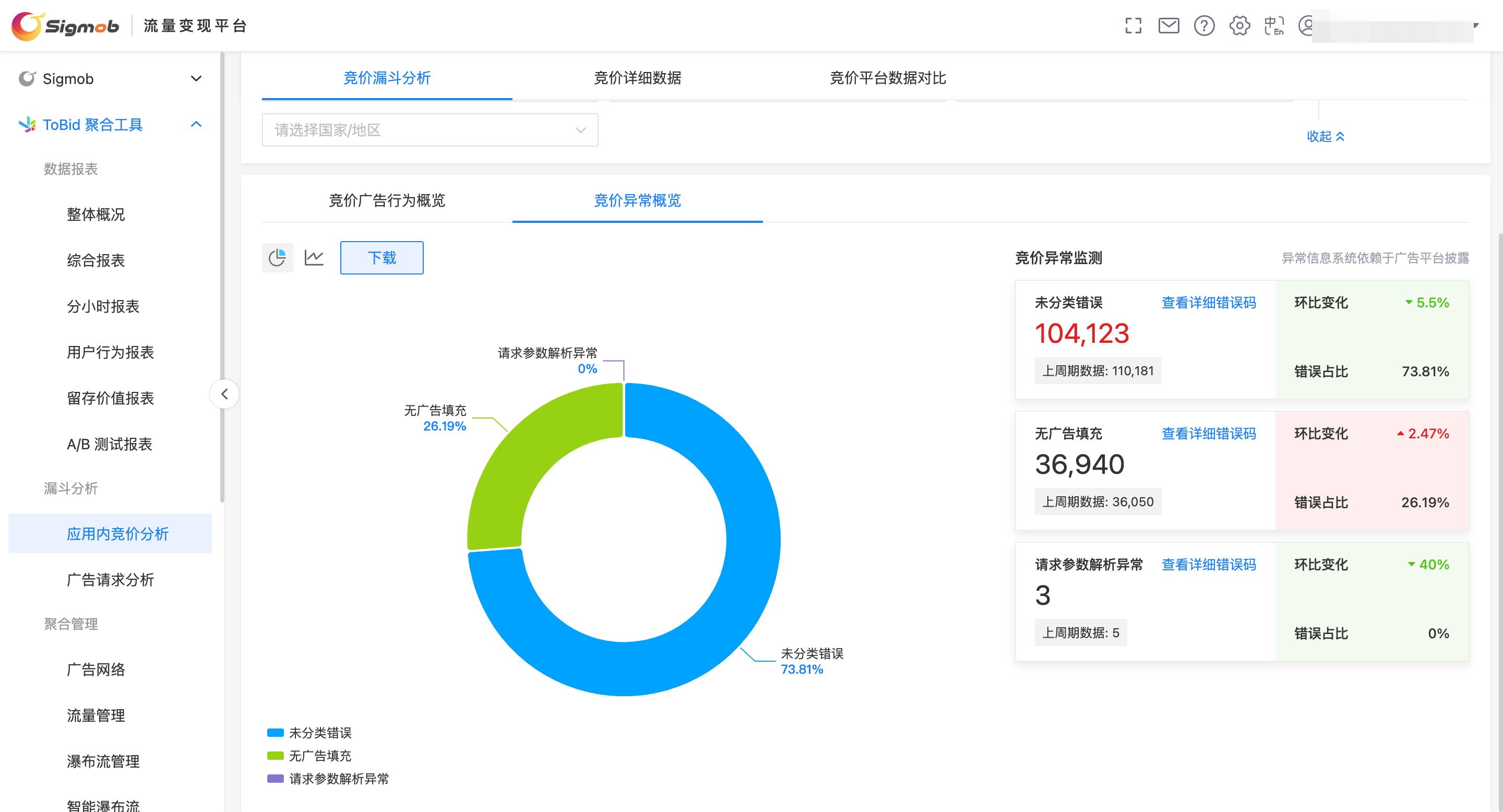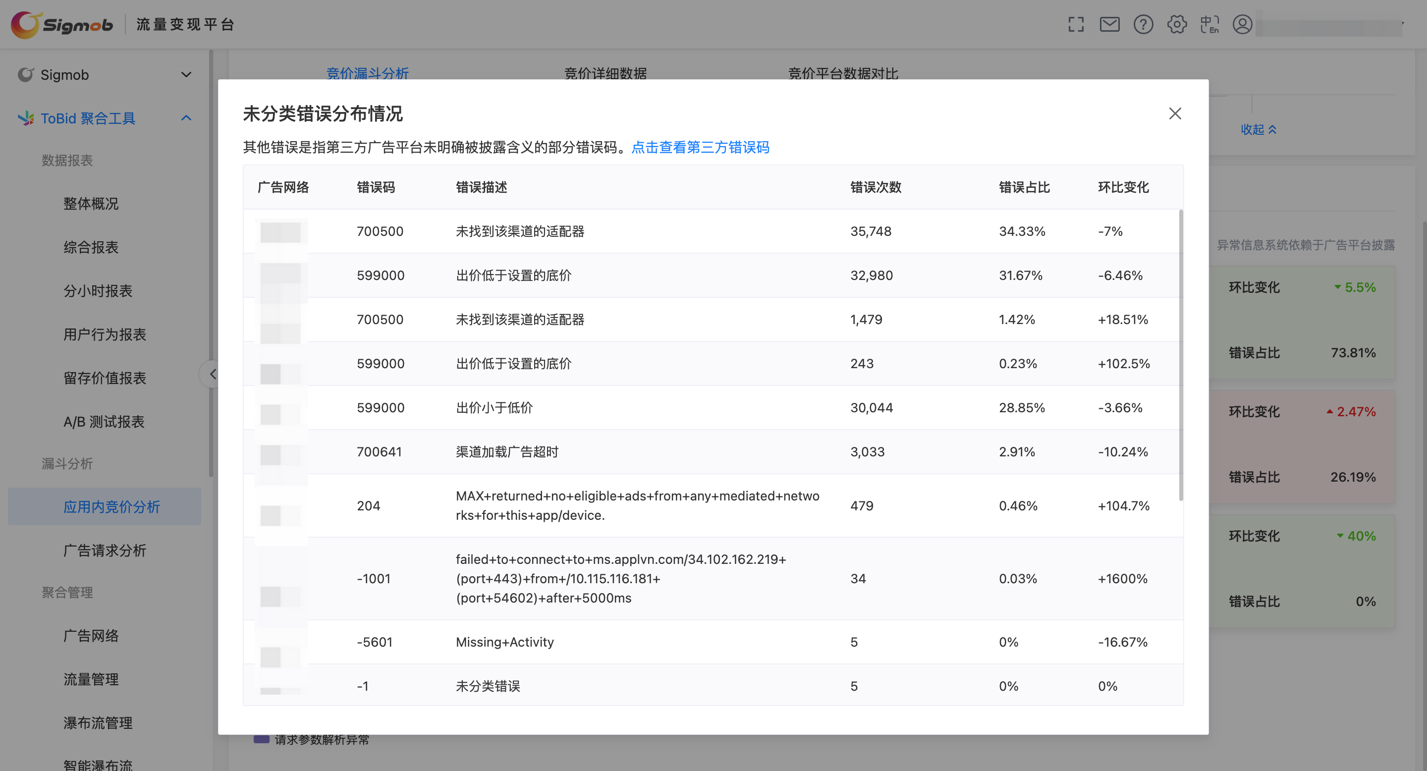 可观测竞价阶段的错误信息大类的占比饼状图或时间趋势图。在竞价异常检测处可查看竞价详细错误码。