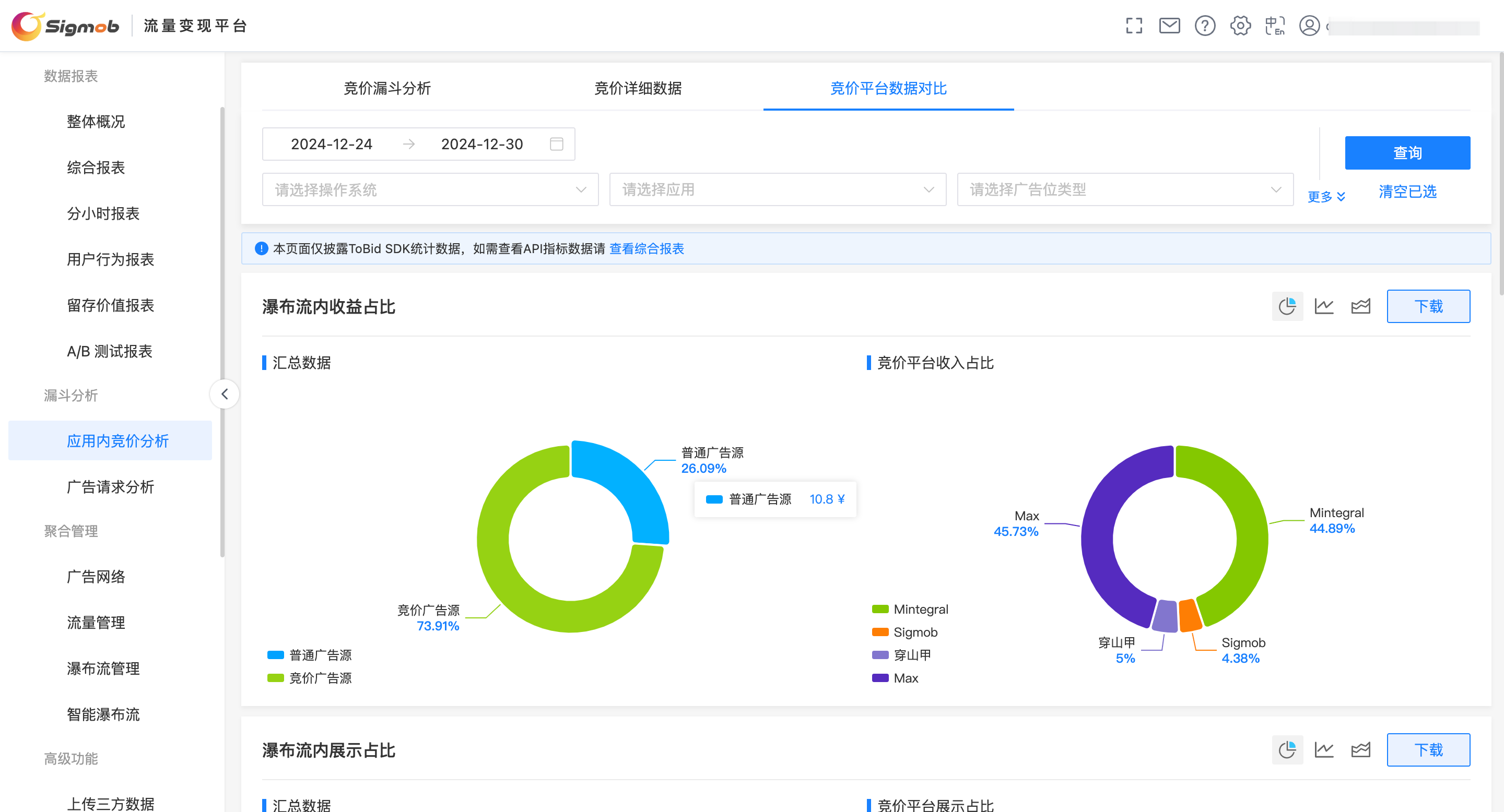 | 披露的数据指标 | - ToBid 统计指标:预估收益(¥)、竞价请求数、竞价响应数、竞价胜出数、竞价响应率、竞价胜出率、广告物料请求量、广告物料返回量、广告物料展示量、广告物料点击量、广告物料填充率、广告物料展示率、广告物料点击率、竞价请求平均耗时(s)、eCPM(¥)、竞价响应平均出价(¥)、eCPC(¥) - API指标:收益API(¥)、请求API、返回API、填充率API、展示API、点击API、点击率API、eCPM API(¥) 、eCPC API(¥) |