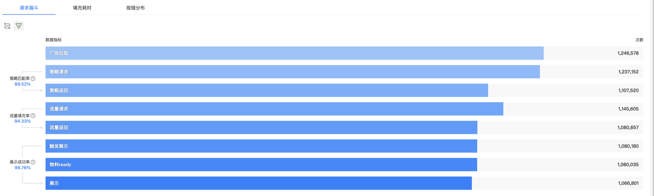 二是,根据Tobid后台-漏斗分析-广告请求分析,筛选该广告位,根据漏斗模型,排查用户流失的环节,确认用户在哪一步流失,导致渗透率偏低。