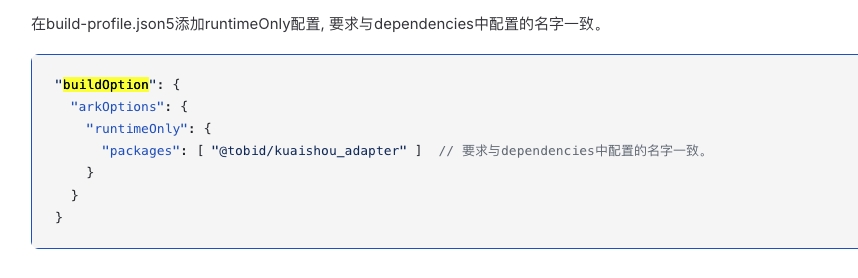 在build-profile.json5添加runtimeOnly配置, 要求与dependencies中配置的名字一致,且应该写在buildOption模块中,请参考: